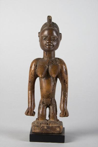 STATUETTA IBEJI di sesso femminile in posizione eretta e poggiante su base quadrata. Arti disposti simmetricamente, con braccia discoste dal corpo; incisioni orizzontali sul volto (scarificazioni) e acconciatura a cresta sagittale. Volto e seni sono enfatitizzati, mentre gli arti inferiori sono sottodimensionati rispetto alle proporzioni naturali del corpo. Le pupille rese con due chiodi piantati nel legno. Superficie tarlata.