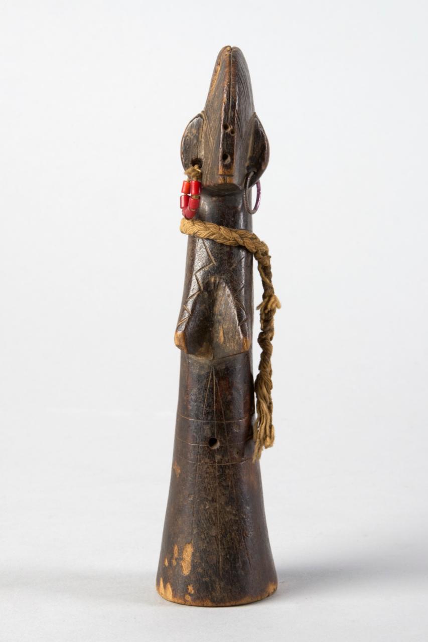 BAMBOLA BIIGA- Figura antropomorfa a base conica. Evidenziati sono la testa, l'acconciatura, le orecchie e i seni. Assente la rappresentazione degli arti inferiori e superiori. Orecchini alle orecchie e corda al collo.