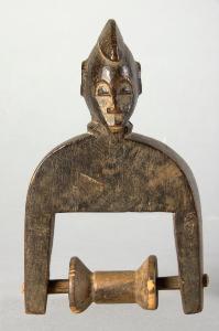 PULEGGIA di telaio PER TESSERE - L'elemento funzionale si combina con quello figurativo: la testa consente di fissare la puleggia al telaio legandola per il collo, mentre il rocchetto è tenuto dalle "braccia" della figura rappresentata. Il volto presenta i tratti tipici dello stile senufo, con volto cuoriforme concavo, occhi a mezzaluna chiusi, prognatismo facciale e acconciatura a cresta.