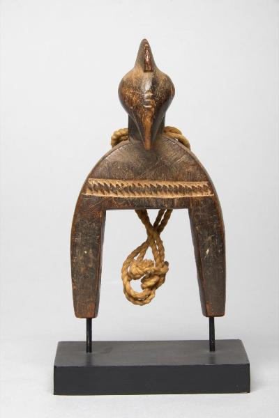 PULEGGIA di telaio PER TESSERE - L'elemento funzionale si combina con quello figurativo: la testa consente di fissare la puleggia al telaio legandola per il collo, mentre il rocchetto è tenuto dalle "ali" dell'uccello, i cui elementi salienti sono il becco e la cresta.