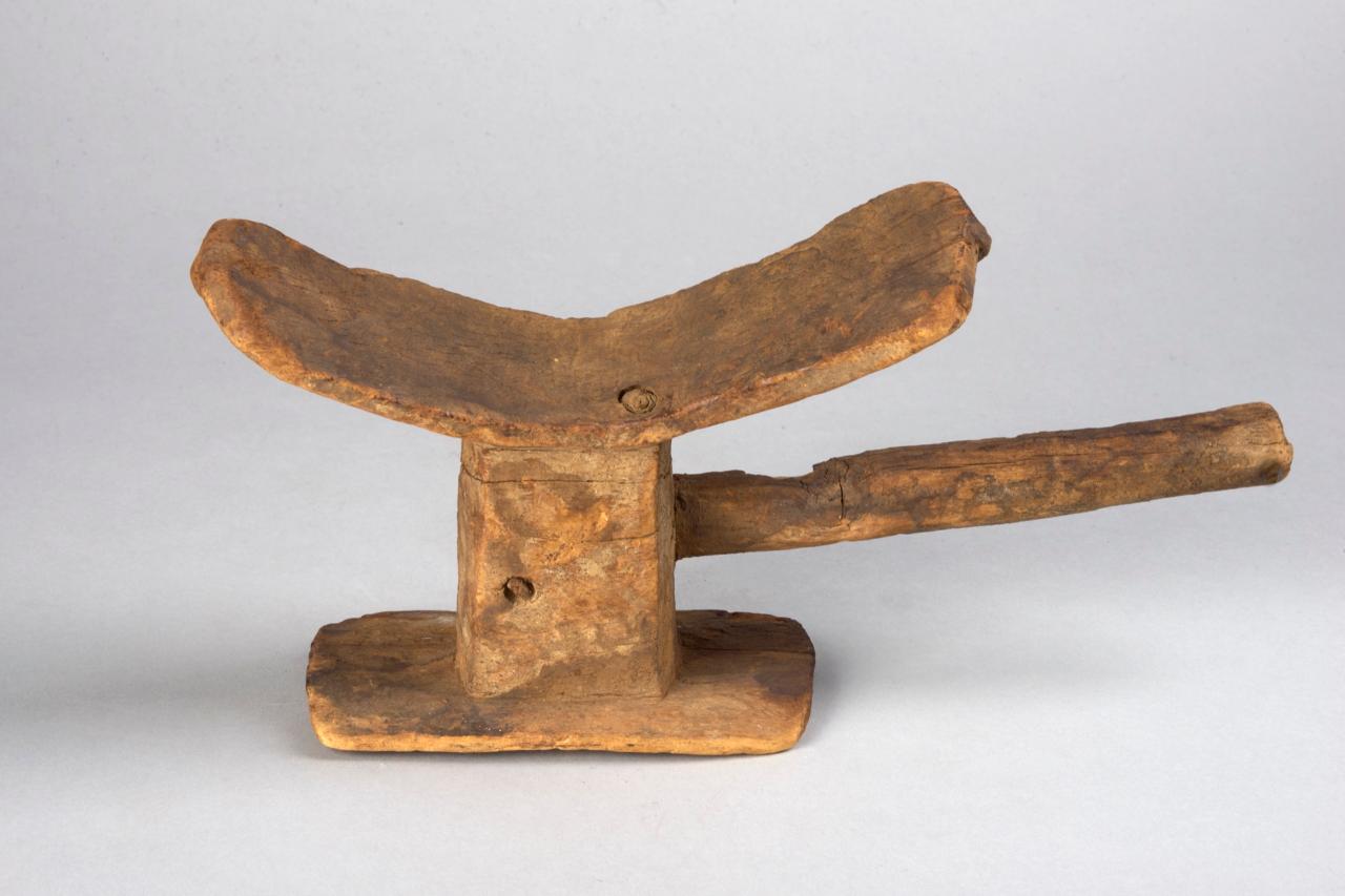 La parte su cui si appoggia la testa è costituita da un piano curvato verso l'alto ed è unita alla base d'appoggio rettangolare da un supporto verticale. Da qui si proietta lateralmente verso l'esterno una sorta di manico che in altri casi assume forme figurative zoomorfe, mentre qui resta non-figurativo.