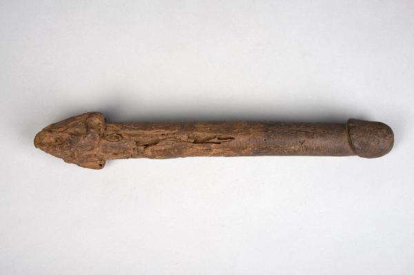 STATUETTA FALLICA - A un'estremità del fallo eretto, il glande. Legno consunto all'altra estremità (probabilmente interrata).