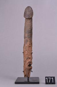 STATUETTA FALLICA - A un'estremità del fallo eretto, il glande. Legno consunto all'altra estremità (probabilmente interrata).