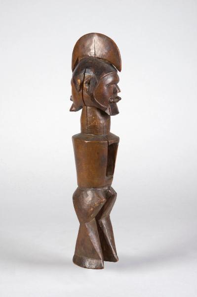 STATUETTA gianiforme in posizione eretta. I due volti hanno in comune l'acconciatura a quarto di luna che si sviluppa dalla fronte dell'uno a quella dell'altro. Le orecchie si toccano. I volti hanno tratti simili: fronte bombata, occhi a mandorla, naso conico, bocca prominente e aperta, di forma ellissoidale, barba squadrata che sporge da sotto il mento. Sul busto di forma troncoconica si apre un grande ricettacolo rettangolare. Le braccia non sono rappresentate. Pene in evidenza. Gambe a clessidra.