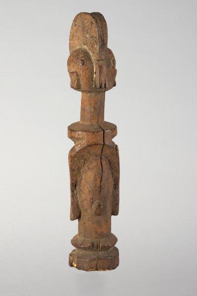 STATUA - Figura antropomorfa con testa a cupola sormontata da alta cresta sagittale e con naso audunco. Collo e busto cilindrici separati dal piano circolare delle spalle. Braccia arcuate e aderenti al corpo. Protuberanza ombelicale. Arti inferiori non rappresentati.