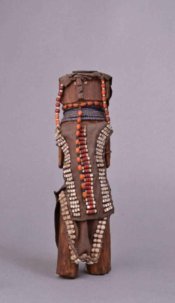 BAMBOLA NGIDE - La figura di legno è rivestita di tessuto con perline sia per confezionarle un abito, sia per indicare i tratti del volto, monili e acconciatura.