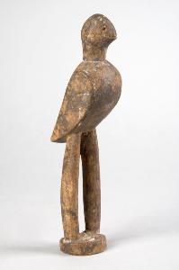 STATUA ZOOMORFA - Uccello dalle lunghe zampe cilindriche poggianti su base cilindrica. Testa sferica con becco e occhi marcati. Corpo, ali e coda costituiscono un unico volume, senza indicazione di dettagli.