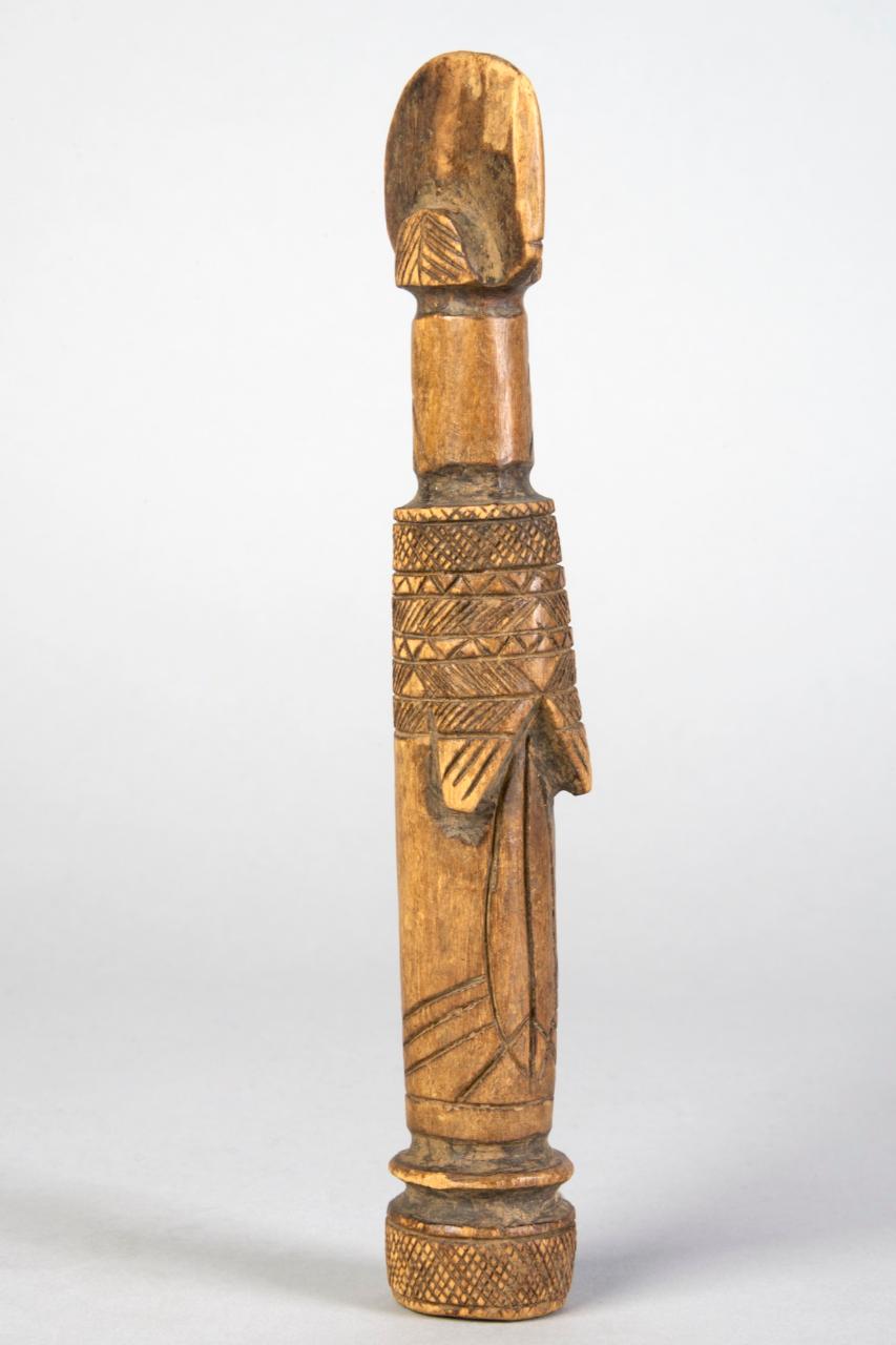 BAMBOLA BIIGA - Nella rappresentazione del corpo, di forma cilindrica, sono omesse gambe e braccia. L'attenzione si focalizza piuttosto sui tratti fisici e sociali che denotano la femminilità: i seni allungati dall'allattamento, l'acconciatura a cresta, le scarificazioni. L'acconciatura fa tutt'uno con la testa appiattita e il volto è ridotto a una sottile linea verticale tagliata solo dalla linea orizzontale della bocca,