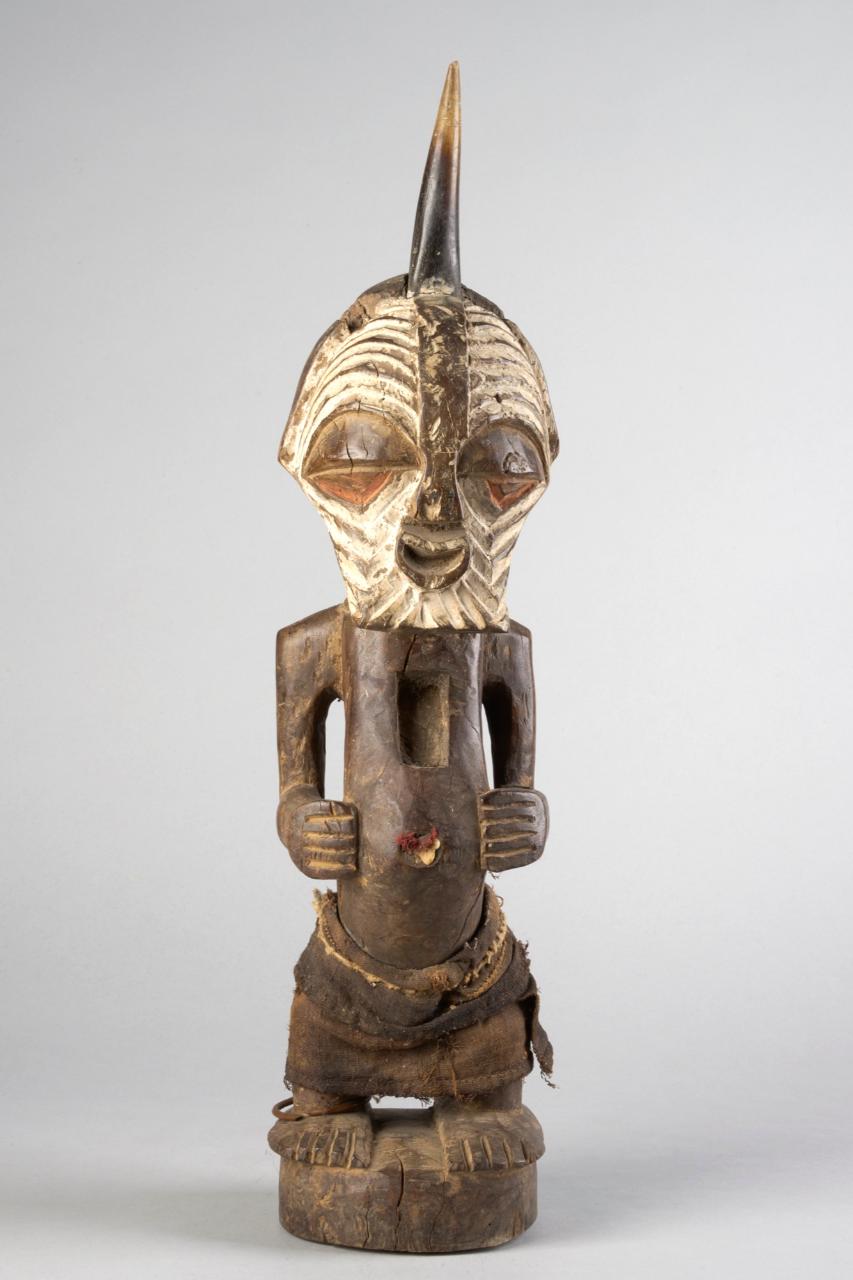 STATUA con il volto che riprende i tratti della maschere kifwebe dei Songye. Sulla sommità un corno. Il corpo presenta arti inferiori breviformi avvolti da tessuto (gonna). Le braccia scendono parallele e discoste dal busto fino al gomito e poi si piegano ad angolo retto verso il ventre protuberante e in particolare verso l'ombelico. Sul torace si apre una cavità di forma rettangolare.
