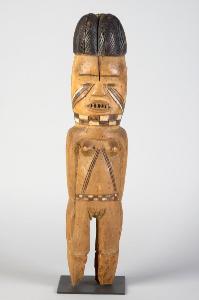 STATUA - Figura antropomorfa femminile (seni e genitali visibili) in posizione eretta. Massiccia testa cilindrica che fa tutt'uno con il collo (evidenziato attraverso la decorazione policroma che ritorna poi all'altezza della vita). Acconciatura multilobata, motivo cruciforme inciso in nero sulla fronte, decorazioni lineari policrome che scendono obliquamente dagli occhi. Naso piatto di forma triangolare, bocca elissoidale con denti appuntiti in mostra.