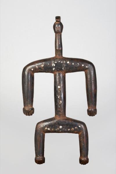 BAMBOLA La scultura lignea rappresenta i tratti essenziali del corpo umano attraverso forme cilindriche elementari. La posizione aperta, quasi ad angolo retto, dellle gambe è del tutto simile a quella della braccia ma con un'apertura di dimensioni più ridotte. Così mani e piedi sono costituiti da brevi appendici molto simili, con piccoli intagli per indicare le dita. Sul volto piccolo e piatto sono marcati occhi, bocca e naso. Acconciatura a cresta sagittale. Su anche, torso e spalle, motivi puntiformi in alluminio.
