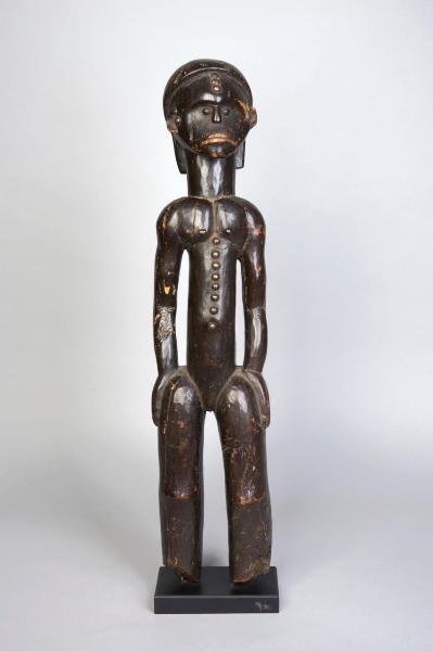 STATUA - Figura antropomorfa di guardiano di reliquario in posizione eretta con gambe leggermente divaricate, braccia che scendono discoste dal busto longilineo e lunghe mani che poggiano sulle anche. Una serie di scarificazioni a bottone (borchie metalliche) salgono dall'ombelico fino al petto. Dello stesso materiale sono fatti gli occhi. Testa con fronte bombata con linea verticale di borchie (scarificazioni) e volto concavo. La curva dell'arcata sopraccigliare è ripresa dalla bocca con labbra curvate verso il basso. Acconciatura che da dietro la testa scende sul collo.