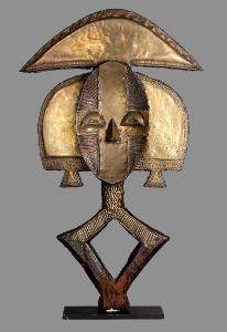 La scultura di legno è rivestita con lamine di metallo. Il volto leggermente concavo poggia su una struttura a losanga che termina con un pomello cilindrico. L'ovale del viso ripartito secondo uno schema cruciforme, è incorniciato da un'acconciatura tripartita che nella parte superiore ha forma di mezza luna. Gli occhi sono di forma ellittica, con chiodi a fare da pupilla e il naso è a sezione triangolare. La bocca è assente.