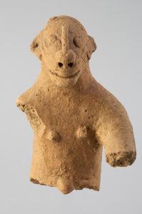 STATUA - Figura antropomorfa spezzata all'altezza dell'ombelico e con braccia fratturate. In evidenza capezzoli e ombelico. Il volto presenta una bocca larga e aperta e naso con grandi narici forate, che parte dalla sommità della fronte. Occhi circolari e orecchie triangolari sporgenti.