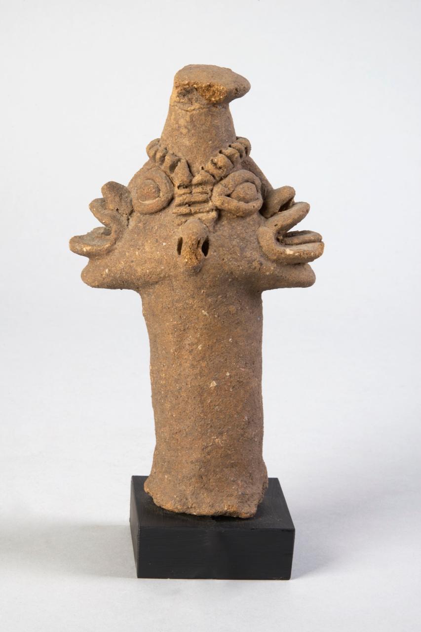 TESTA BIFRONTE - Su di un lungo collo cilindrico è posta una testa conica con due volti che si danno le spalle. Grandi occhi con contorno in rilievo, bocca spalancata, orecchie forate e svasatura sulla sommità.