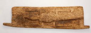 PORTA DI GRANAIO - Su un lato, in alto e in basso, i cardini; sulla superficie, in rilievo, la figura di una lucertola con zampe anteriori e posteriori piegate ad angolo retto.