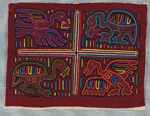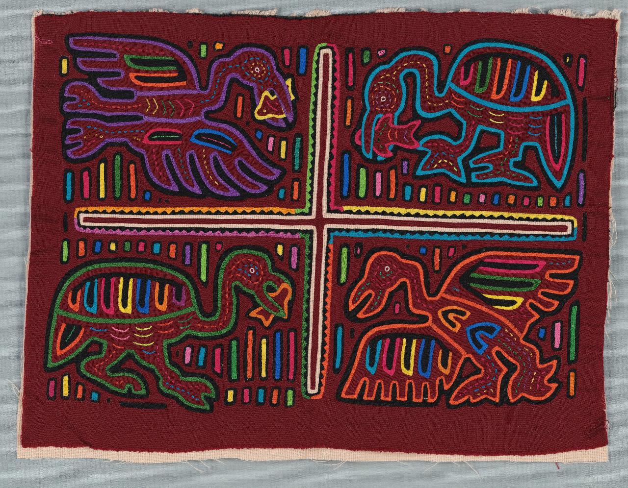 Pannello quadrangolare di tessuto a più strati sovrapposti su cui è stato realizzata tramite il ritaglio una divisione in 4 settori, con un uccello per ciascun settore su fondo bordeaux.