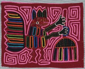 Pannello quadrangolare di tessuto a più strati sovrapposti su cui è stato realizzata tramite il ritaglio una figura zoomorfa fantastica crestata e alata su fondo bordeaz riempito da motivi geometrici.