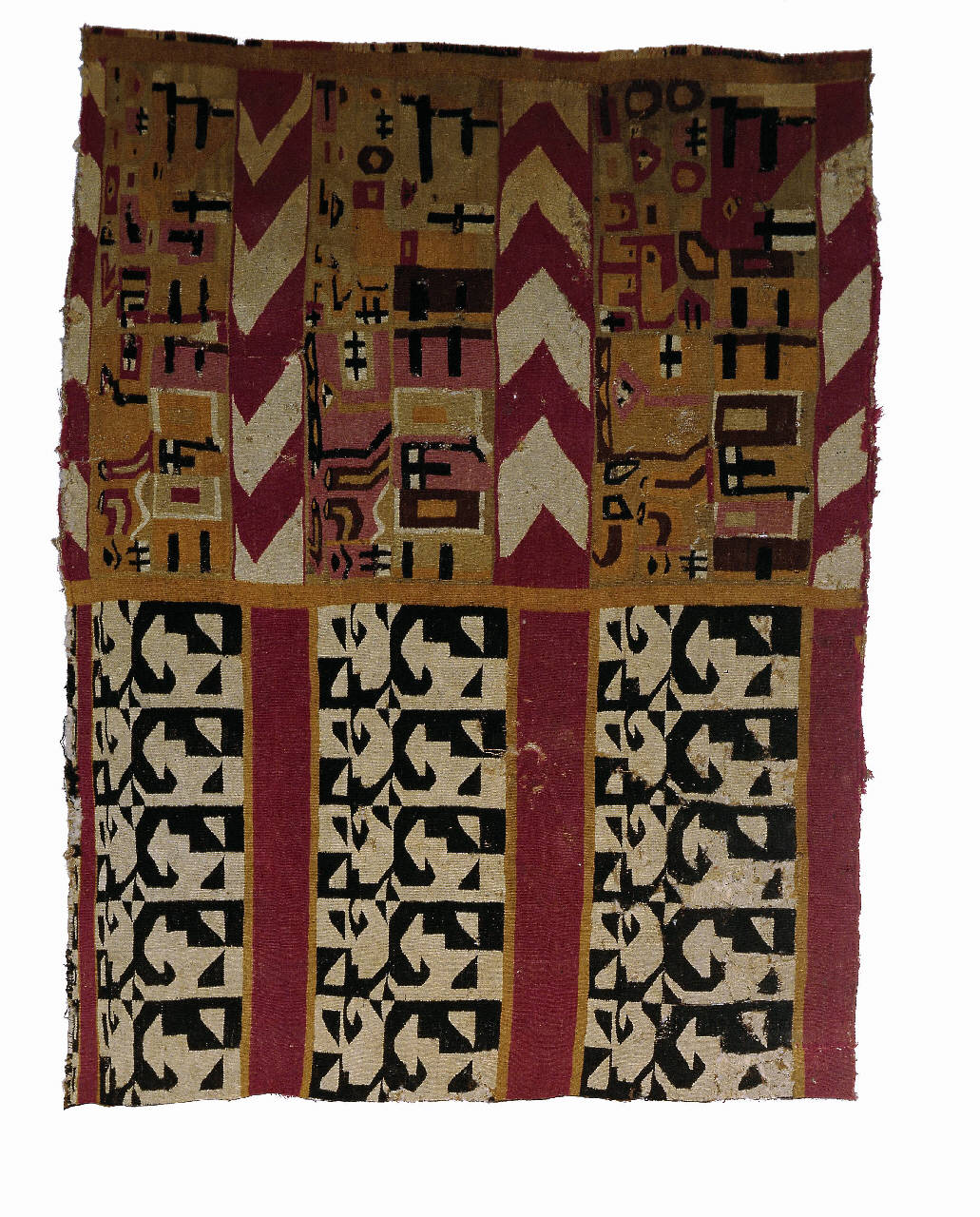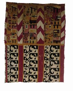 Parte di manto. Il reperto presenta una serie di registri decorativi con i tipici motivi dell'iconografia Huari-Tiahuanaco. Si notano una serie di elementi geometrici quali le V sovrapposte, tracce di greche scalonate, occhi, appendici zoomorfe. Gli orditi sono portati orizzontalmente, i disegni sono schiacciati sulle fasce laterali esterne e ribadiscono la provenienza.