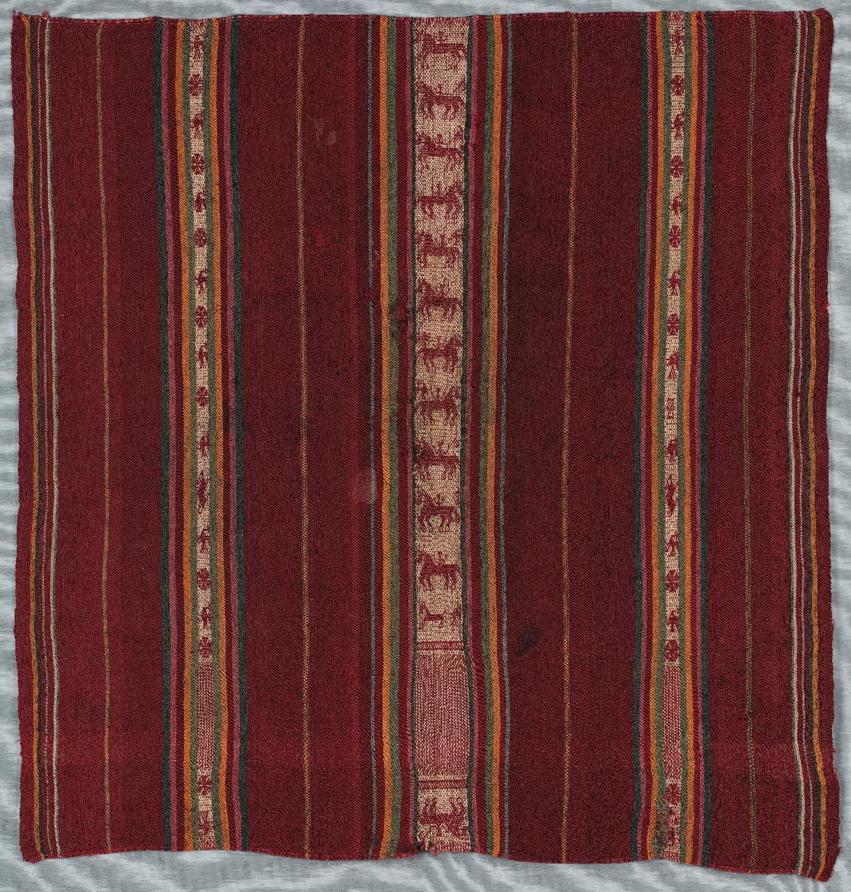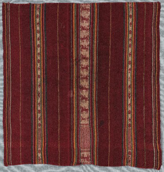 Metà di poncho (?) a fondo rosso con disegni in bande verticali verso gli estremi del tessuto dove si rappresentano fiori, "patos de lago" e un roditore (vizcacha?), le bande centrali rappresentano invece dei cavalieri.