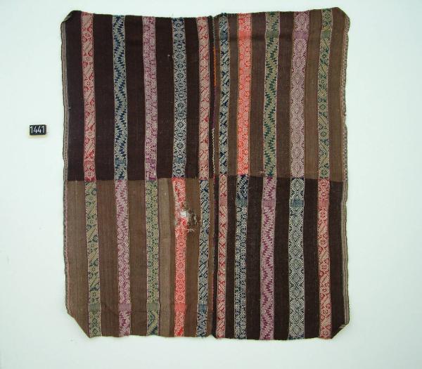 Manta composta da due pezze unite nel senso della lunghezza. L'ordito di fondo alterna marrone chiaro a scuro e la decorazione è fatta di cinque strisce di motivi stilizzati per pezza. \nSono presenti motivi decorativi a tinte naturali che riproducono il fiore della patata (papa tika), la forma stilizzata del fiume con un corso a zig zag (mayu q’enqo) e altri motivi geometrici tipici della tradizione decorativa della Sierra del Cusco.