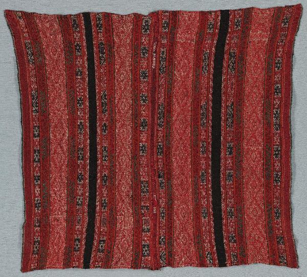 Manta ad uso cerimoniale composta da due teli, tessuti con telaio a cintura, uniti fra loro nel senso della lunghezza con filo di lana. Disegno a righe nei colori del rosso, nero e bianco, una riga monocroma nera su ogni telo.