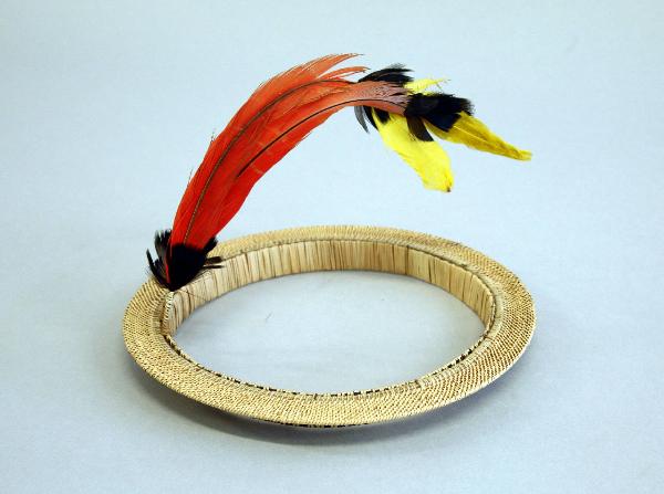 Ornamento per la testa di legno, fibra intrecciata, penne e piume composto da un cerchio di legno di 16,5 cm di diametro, di 2 cm di altezza e di 0,2 cm di spessore, a cui è legato un altro cerchio verticale di fribra intrecciata rigida. Il cerchio orizzontale ha un diametro esterno di cm 21,5, una larghezza di cm 2 e una spessore di cm 0,2. Il cerchio verticale è decorato con una stuoia bicolore, il cui intreccio dà vita a una sequenza continua di triangoli alternati chiaro e scuro. A questo cerchio sono fissati due bastoncini decorati ciascuno con una piuma nera, una penna rossa, una piuma nera e 2 gialle. Le piume sono tenute insieme da una resina. Il bastoncino misura 5 cm, le piume nere 2,5 cm quella rossa 16 e quella gialla 6.