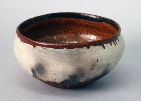 Ciotola domestica in terracotta con orlo dritto. Il corpo del vaso esternamente é dipinto con caolino e verniciato con resina naturale, mentre all'interno è decorato con motivi geometrici realizzati con pigmento rosso e nero su fondo color ocra. Si tratta di puntini neri in doppia fila su fondo color ocra delimitati da linee rosse che percorrono l'intera superficie interna del vaso.