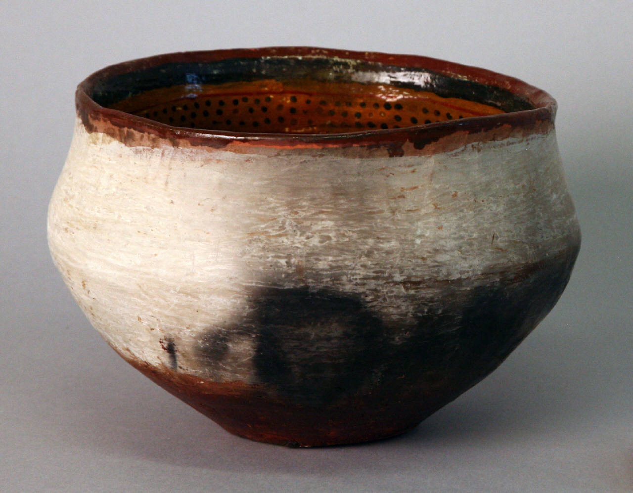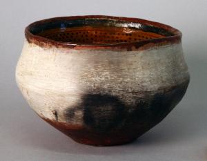 Ciotola domestica in terracotta con orlo dritto. Il corpo del vaso esternamente é dipinto di bianco e verniciato con resina naturale, mentre l'interno è decorato con motivi geometrici realizzati con pigmento rosso e nero su fondo color ocra. Si tratta di puntini neri delimitati da linee rosse che occupano l'intera superficie interna del vaso.