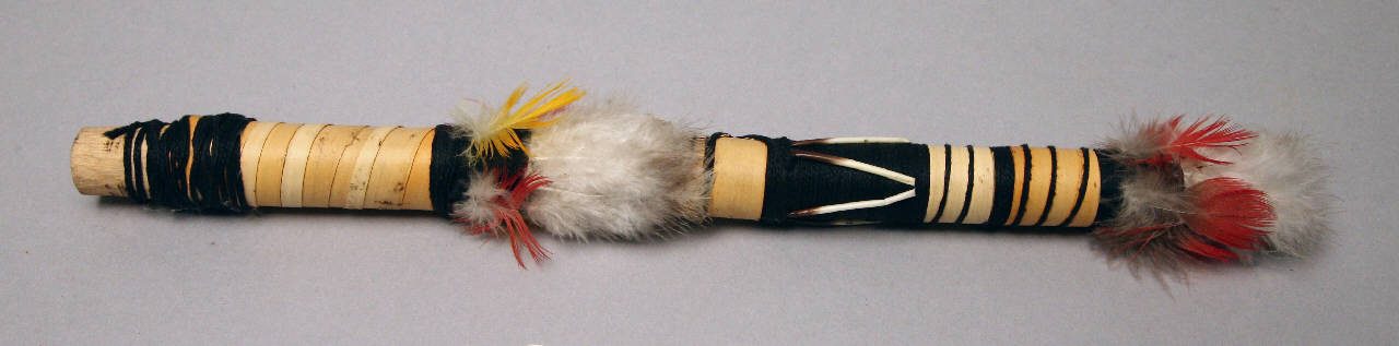 Flauto di legno, decorato con filo nero e rivestito di corteccia di liana. Circa a metà dello strumento e alla fine sono legate al filo: piumino bianco, piume gialle e rosse di ara, inoltre a metà fra queste, sempre fissati con il filo, sono presenti aculei di porcospino (Coendou prehensilis) che creano un motivo a V.