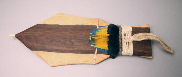 Scettro in legno, realizzato intagliandone la sagoma a forma di pesce. La parte centrale è di colore bruno-marrone e sulla impugnatura sono fissate rispettivamente verso l'esterno a una fascia di filo di cotone bianco intrecciato una corda di cotone a guisa di coda e verso l'interno una fascia di corte penne nere da cui fuoriescono penne gialle-blu variegate. Sull'estremità è stata fissata una punta in osso.