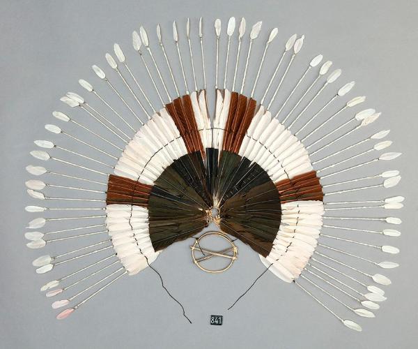 Ornamento occipitale per la testa in piume, penne e legno: si tratta di sessanta bastoncini di legno di circa 50 cm di lunghezza legati a raggiera con fibra vegetale, avvolti con cotone nella parte terminale, circa cm 20; a metà di ogni bastoncino è fissata una penna di 15 cm, di colore marrone o rosato; in cima, una piuma bianca rosata. Le penne rosa sono 46, mentre le marroni sono 14 e si trovano nelle posizioni da 11 a 14, da 25 a 27, da 32 a 34 e da 35 a 38. La parte inferiore dei bastoncini è coperta da un ventaglio di 31 penne di colore marrone scuro, lunghe cm 20 e con la punta tagliata. Completa l'oggetto un cerchio di corteccia a cui è legata una X, sempre di corteccia, con probabile funzione di fissaggio della corona al capo.