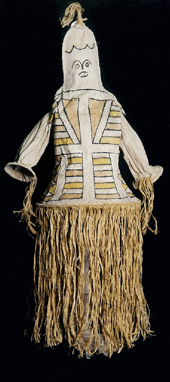 Maschera antropomorfa realizzata in corteccia battuta che riveste l'intero corpo del danzatore fino alle ginocchia. Il volto é dipinto con tratti realistici, mentre il corpo è decorato con motivi geometrici rettangolari e triangolari a bande nere e gialle, che simulano il manto di un animale. Si noti il trattamento della capigliatura, che riprende l'antico costume degli uomini di portare i capelli raccolti in un muccio o chignon. Sul fondo sono cucite delle lunghe frange in fibra vegetale. Il tutto é mantenuto in forma da supporti circolari in legno inseriti all'altezza della vita e in fondo alle maniche.