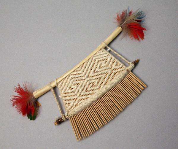 Pettine di legno e osso, con i denti fissati a due supporti, quello di legno avvolto in filo di cotone bianco e quello d'osso con piume rosse applicate alle estremità. Tra i due supporti un intreccio in filo di cotone rettangolare presenta un disegno a volute.