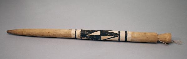 Bastone realizzato in un unico pezzo di legno, la cui parte centrale è decorata con motivi geometrici romboidali dipinti con pigmento nero su fondo bianco.
