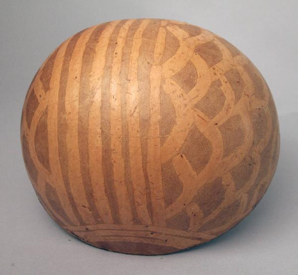 Ciotola semisferica realizzata con una zucca svuotata e lasciata seccare e successivamente ricoperta con una lacca naturale per impermeabilizzarla. La zucca all'interno ha un colore scuro, mentre l'esterno è decorato con un motivo geometrico dipinto di linee rette e curve.