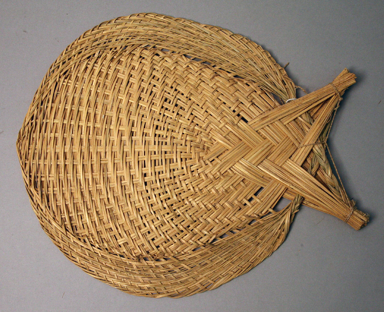 Ventola di fibra vegetale a forma di conchiglia/pesce, con intreccio misto a scacchiera e a spina di pesce.