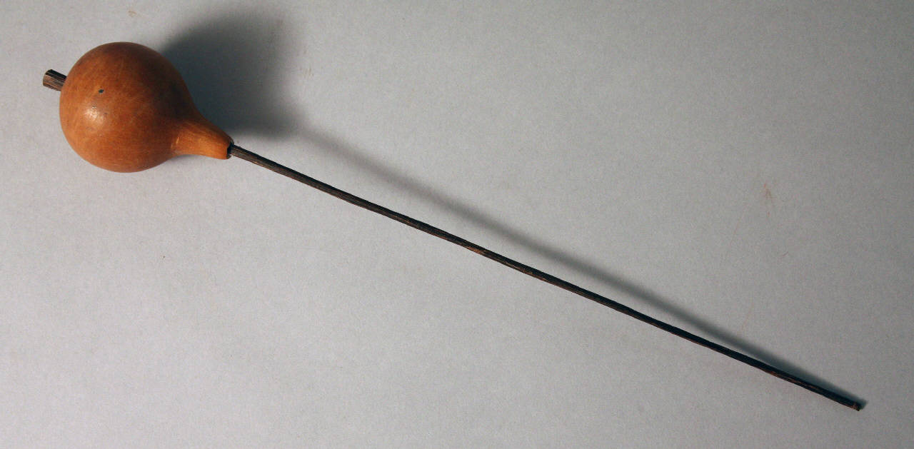 Fuso in legno con fusaiola in zucca. La fusaiola è una piccola zucca essicata al cui interno sono ancora presenti i semi.