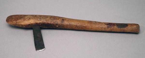 Ascia in legno con lama in ferro inserita in una fessura del legno e fissata con sostanza collante.