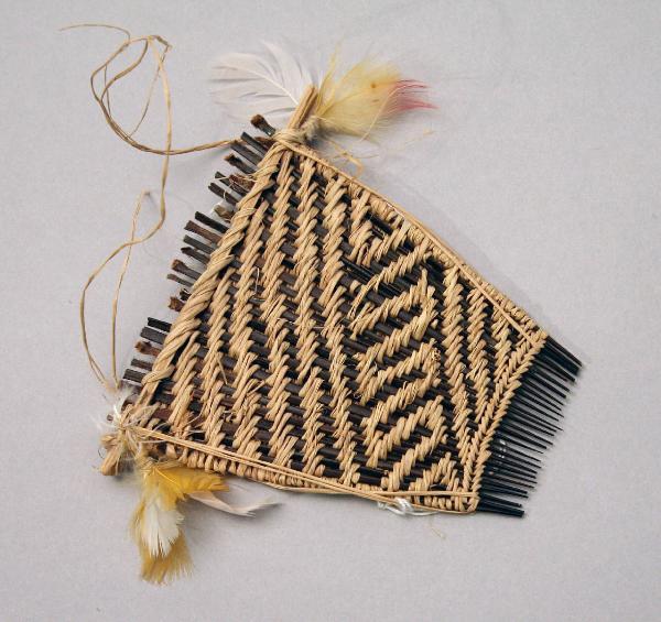 Pettine quadrangolare con denti in legno tenuti insieme da filo di cotone intrecciato che forma un disegno a diagonali e con una linea ondulata centrale. Piume rosa e gialle sono fissate ai due angoli superiori. Reca cordicella di sospensione in fibra vegetale.