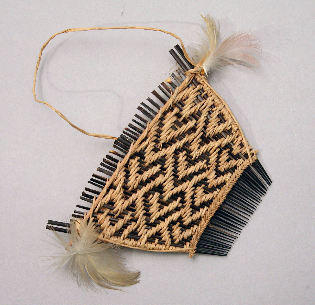 Pettine quadrangolare con denti in legno tenuti insieme da filo di cotone intrecciato che forma un disegno ripetuto di frecce. Piume bianche sono fissate ai due angoli superiori. Reca cordicella di sospensione in fibra vegetale.