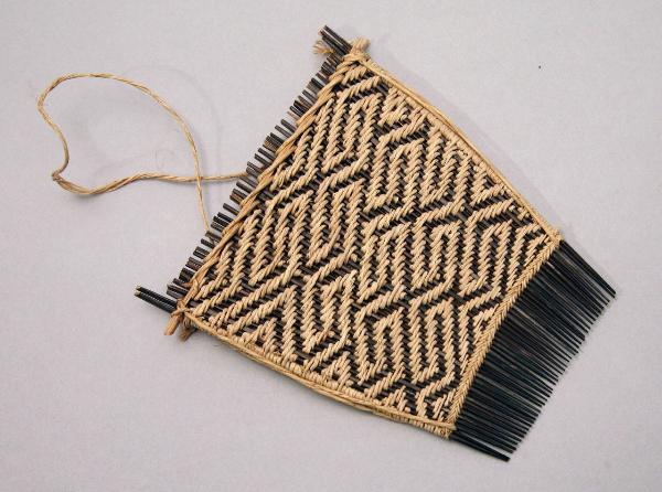 Pettine quadrangolare con denti in legno tenuti insieme da filo di cotone intrecciato che forma un disegno a volute. Reca cordicella di sospensione in fibra vegetale.