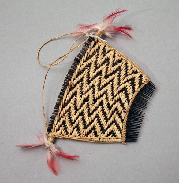 Pettine quadrangolare con denti in legno tenuti insieme da filo di cotone intrecciato che forma un disegno a linee spezzate. Piume rosa sono fissate ai due angoli superiori. Reca cordicella di sospensione in fibra vegetale.