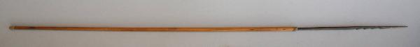 Freccia con asta di bambù e punta in legno seghettata.