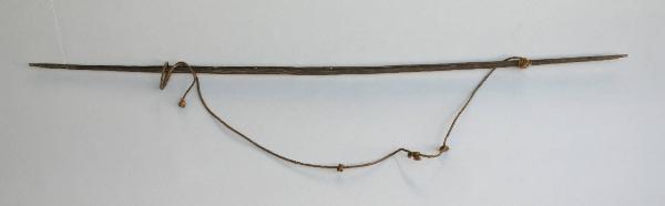 Arco in legno, con corda in fibra vegetale, fissate alle estremità rastremate.