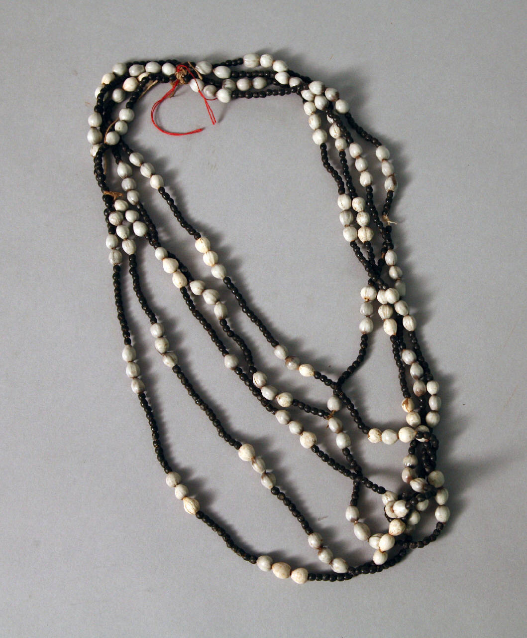 Collana di semi. I semi usati sono di due tipi diversi, uno bianco più grande e uno nero più piccolo. I semi sono alternati tre bianchi e sei neri.