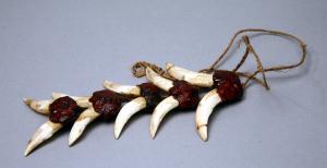 Collana con filo in fibra vegetale e pendente formato da dieci denti di jabali disposti su due file verticali di cinque ciascuna.