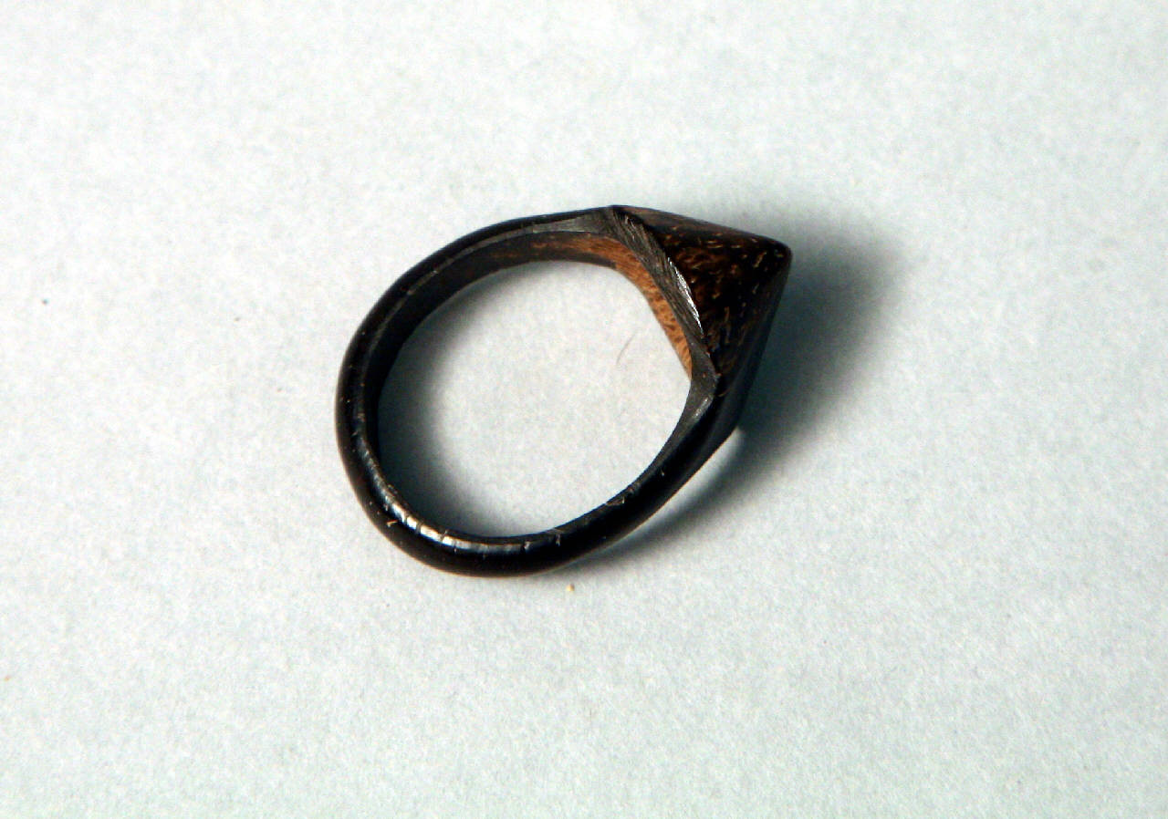 Anello in guscio di noce di cocco, ricavato da un pezzo unico, il castone è rappresentato da un ispessimento di forma irregolare.