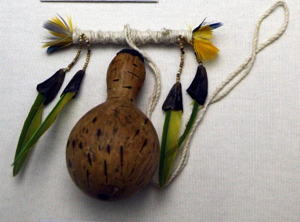Strumento a fiato costituito da una zucca essiccata e pirografata fissata con cotone al centro di un bastoncino ligneo intorno al quale è avvolto filo di cotone bianco ed alle cui estremità sono fissati ciuffetti di piume gialle e azzurre. Dalle due estremità del bastoncino pendono inoltre due fili di perline per lato a cui sono fissate due unghie di cinghiale che contengono una penna verde-blu ciascuna. La superficie della zucca, che funge da sonaglio, è ricoperta da motivi neri incisi a fuoco con un pezzo di legno, orizzontali lungo l'imboccatura e verticali lungo il ventre.