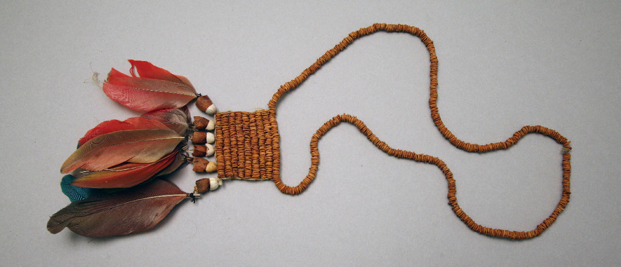 Collana di semi con pendente di semi e piume. La collana è formata da un unico giro di semi tutti uguali, su cui è inserito il pendente, formato da nove file di semi uguali a quelli del giro a cui sono fissati sei pendenti tutti uguali, ciascuno formato da mezzo seme bianco, mezzo seme marrone e due piume. Le piume sono in tre casi rosse-blu e in tre rosse.